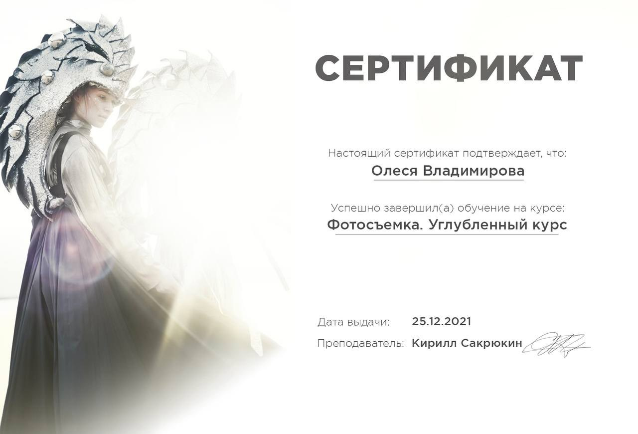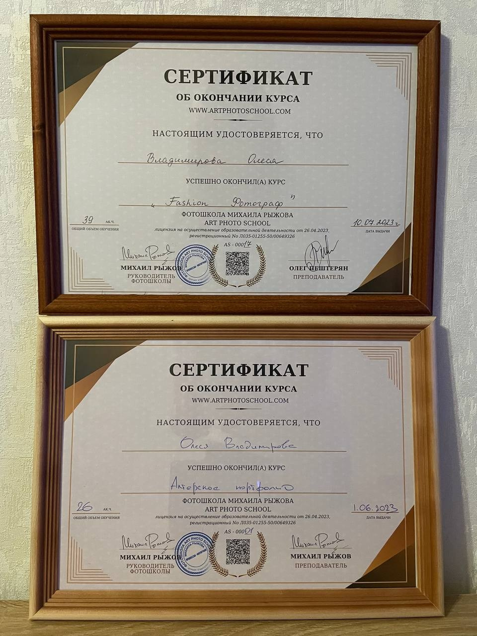 - Обучалась в фотошколе курс: «Основы фотографии», «Актерское портфолио», «Fashion фотограф», «Фотограф по маркетплейс», «От идеи до реализации», различные мастер-классы, курс: «Цветокоррекция», «Журнальная ретушь», до сих пор постоянно развиваюсь,